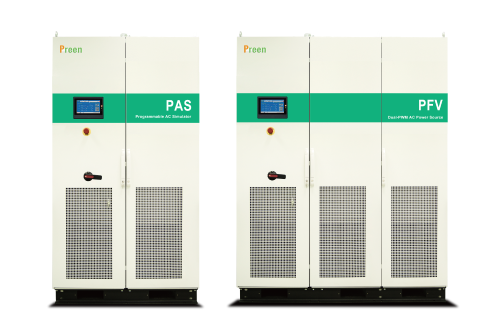 PAS 系列單機輸出功率可達200??0kVA,PFV 單機輸出功率可達400??kVA,輸出電壓范圍皆為0-300V,輸出頻率為45-65Hz 連續可調或選配40-70Hz 連續可調,通訊介面為RS-485 / RS-232 或選配GPIB、Ethernet、USB,更有標配或選配的三相獨立可調、相位角可調、及能源回饋功能。