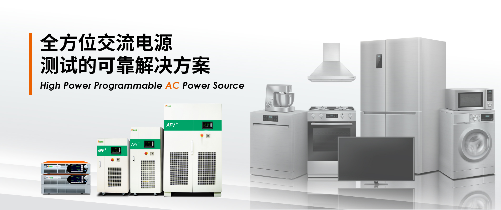 AFV+系列大功率可編程交流電源,采用先進PWM高頻開關切換技術設計,可提供純凈正弦波輸出,總諧波失真(THD) ≤0.5%,頻率精準度±0.02%,可輸出45-500Hz (A版)、45-120Hz (B版)、300-840Hz (C版) 連續可調,單機輸出容量可高達2000kVA,可模擬世界各地不同的電壓及頻率輸出特性,涵蓋了各產業應用需求如:家電、電機馬達、醫療設備、照明等,并適合EMC實驗室、認證/研發單位等有高精密或復雜的電源應用場合。