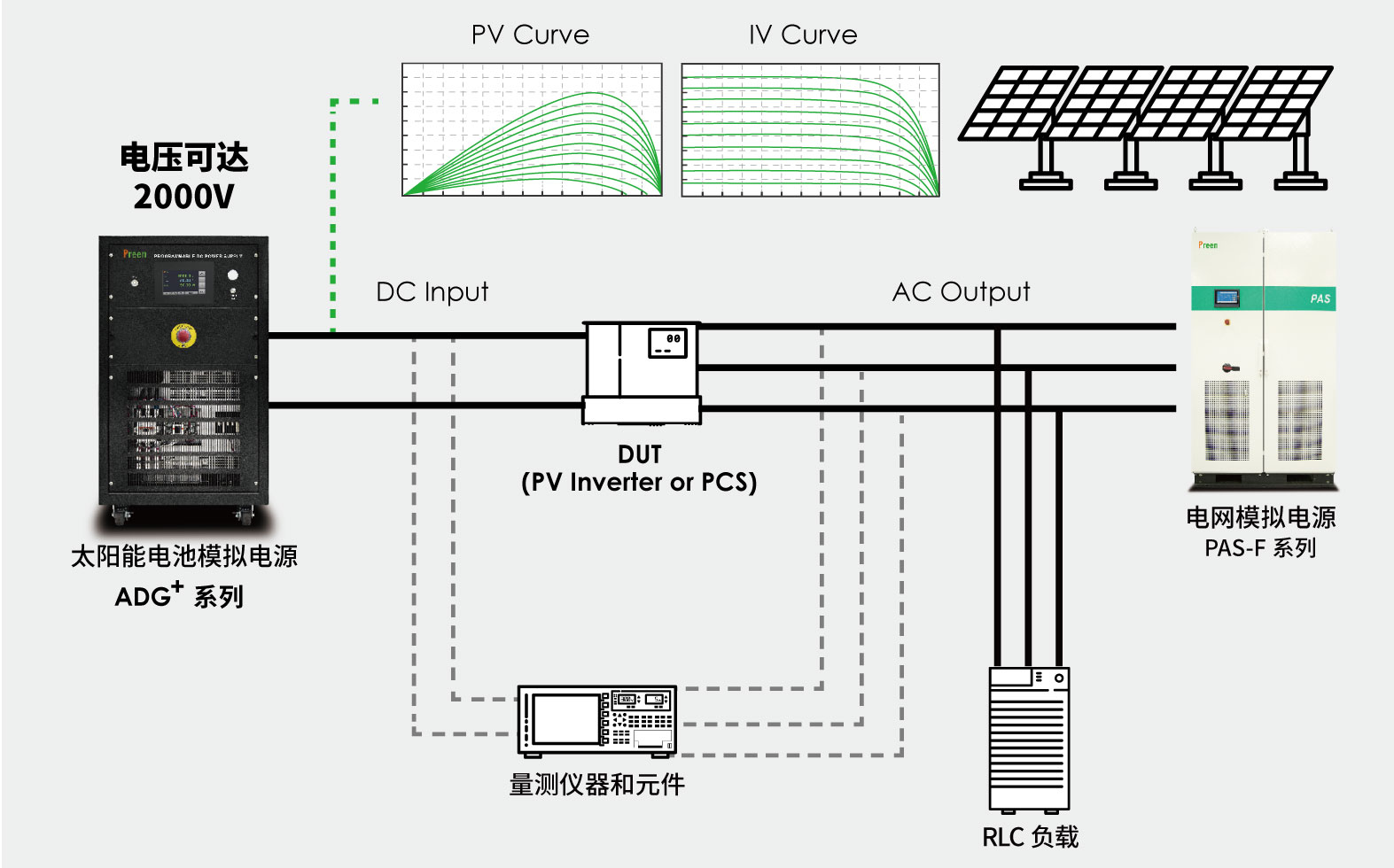 Preen艾普斯電源針對光伏行業(yè)發(fā)展趨勢,也對ADG系列直流電源產(chǎn)品,進行了光伏多項電池仿真功能的更新,更能滿足光伏逆變器廠家的測試需求。其ADG系列電壓可高達2000V,最大功率達到1.2MW,也可透過多臺并機組建,可達到多路MPPT同步控制的光伏仿真電源,具有測量精準、穩(wěn)定性高、響應(yīng)速度快等特性,其I-V曲線功能包含EN50530、Sandia等SAS 模型,可完成標準的光伏逆變器的靜態(tài)& 動態(tài)最大功率追蹤測試 (MPPT),也可根據(jù)使用者之需求生成符合法規(guī)的報表。用戶也可以通過自定義太陽能電池板模型及溫度變化,另可選配自定義陰影遮蔽等,以更靈活的方式完成測試模擬。