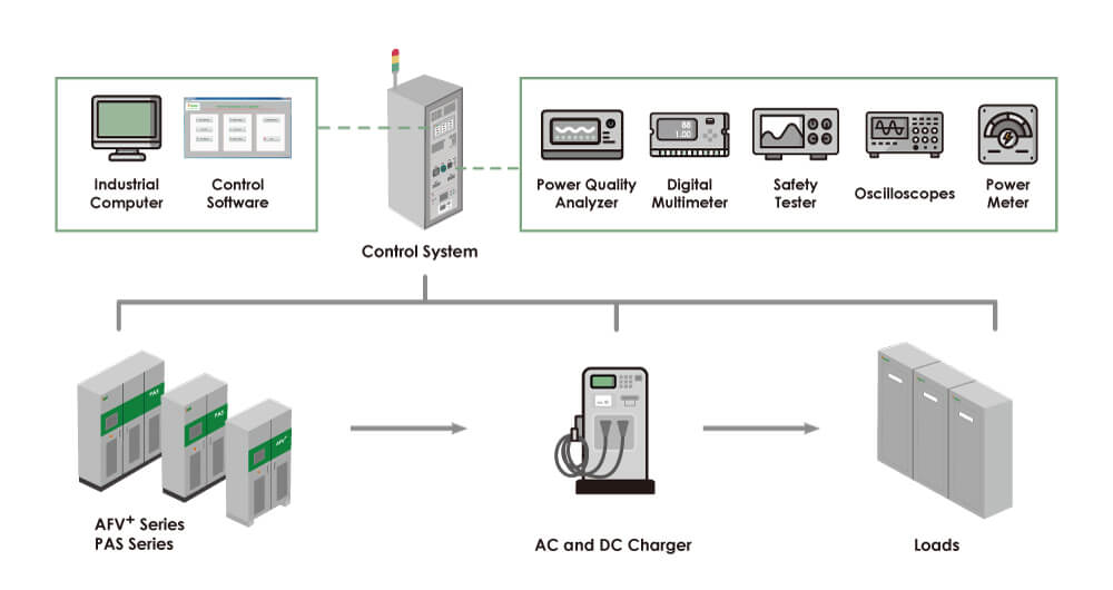 除了充電的便利性,充電所需時間也是眾所矚目的焦點之一,根據輸出電流又可細分為AC慢充與DC快充,市面上根據各國規范有對應的規格與標準,相關法規如SAE-J1772、UL 2202、IEC 62196、ChAdeMO、GB/T 18487等。對于艾普斯電源而言,提供使用者精準且可靠的測試解決方案,讓使用者創造兼顧效能與安全的產品是我們的使命,因此我們推出了電動車交直流充電樁測試系統(EVSE ATS)。