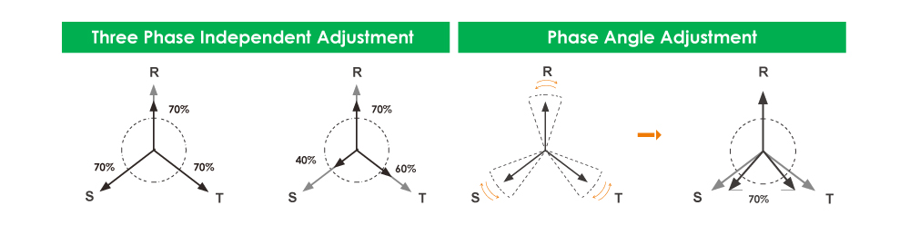 可獨立設置三相的電壓數值,使AFV不僅能作為三相機使用,亦能作為三個單相機型供操作,且各相能分別驗證不同電壓之待測物,有效提升測試的便捷性。此外,亦能調整各相之間的角度,模擬相位不平衡時對待測物所帶來之影響。