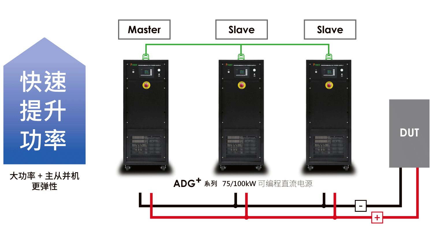 ADG+ 系列為一款全新升級的大功率可編程直流電源,擁有低紋波、高精度、反應速度快等特點,透過選配的I-V 曲線功能,可輕松模擬太陽能電池陣列之不同特性,其專利模塊設計加上簡易的主從并機模式,功率可達1800kW,電壓更可達最高2000V,適合用于電動汽車電機、DC/DC 轉換器、儲能系統(ESS)、光伏變流器等測試應用。