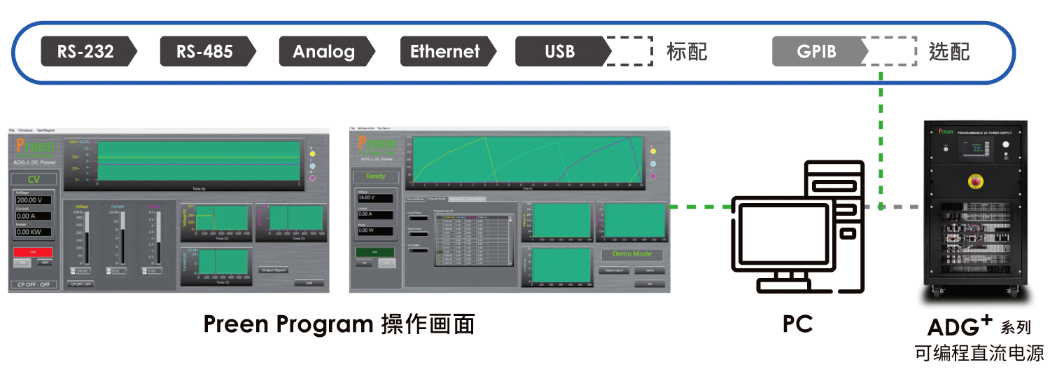 Preen 的ADG+ 系列為一款全新升級的大功率可編程直流電源,擁有低紋波、高精度、反應速度快等特點,透過選配的I-V 曲線功能,可輕松模擬太陽能電池陣列之不同特性,其專利模塊設計加上簡易的主從并機模式,功率可達1800kW,電壓更可達最高2000V,適合用于電動汽車電機、DC/DC 轉換器、儲能系統(ESS)、光伏變流器等測試應用。